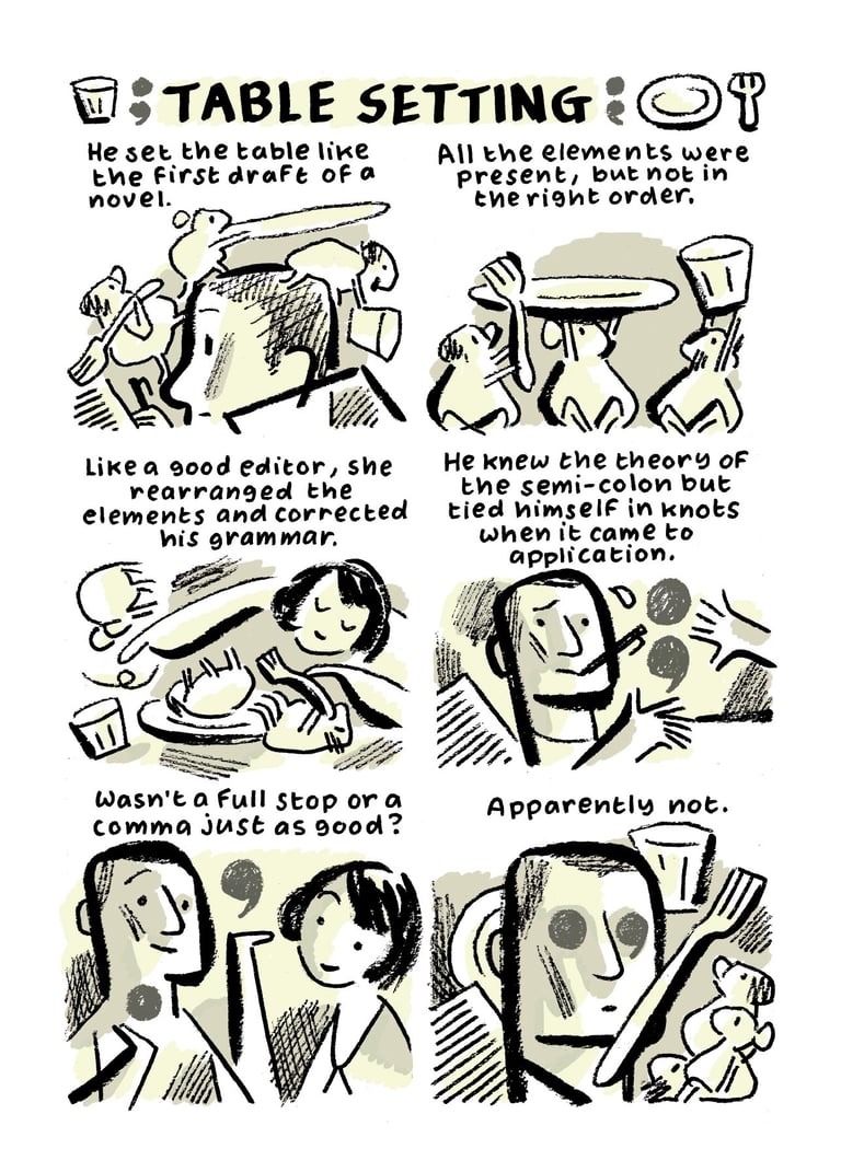 Full colour 4x6" mini comic. 16 pages inc covers. Contains two stories: Love Removal Men and Table Setting.