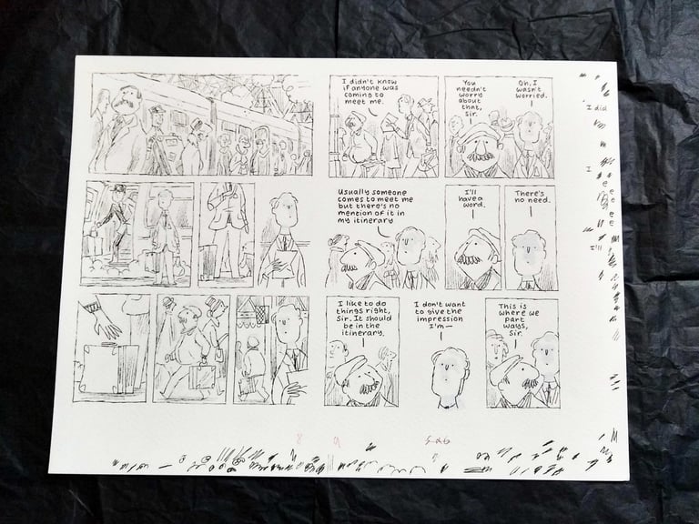 Two pages from The Book Tour published in English by Top Shelf in 2020. From early in the book, writer G.H. Fretwell arrives in the city to start his book tour. He is met by someone he thinks is his driver and where his troubles begin. Pen on 32x24cm 200 gsm watercolour paper. Posted flat and tracked.