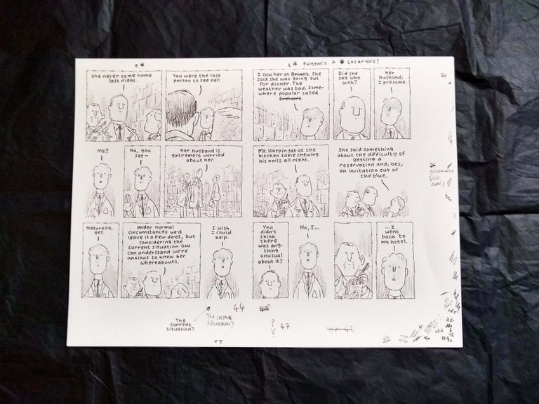 Two pages from The Book Tour published in English by Top Shelf in 2020. Writer G.H. Fretwell arrives in the city for his book tour but is soon being questioned by the police about a missing person. Pen on 32x24cm 200 gsm watercolour paper. Posted flat and tracked.